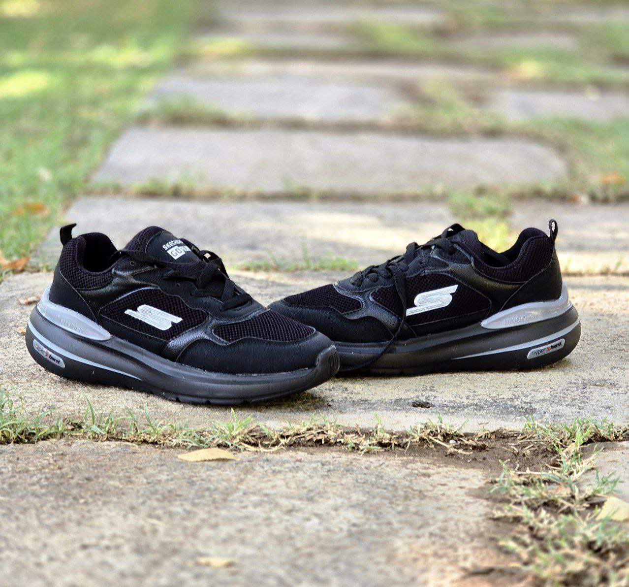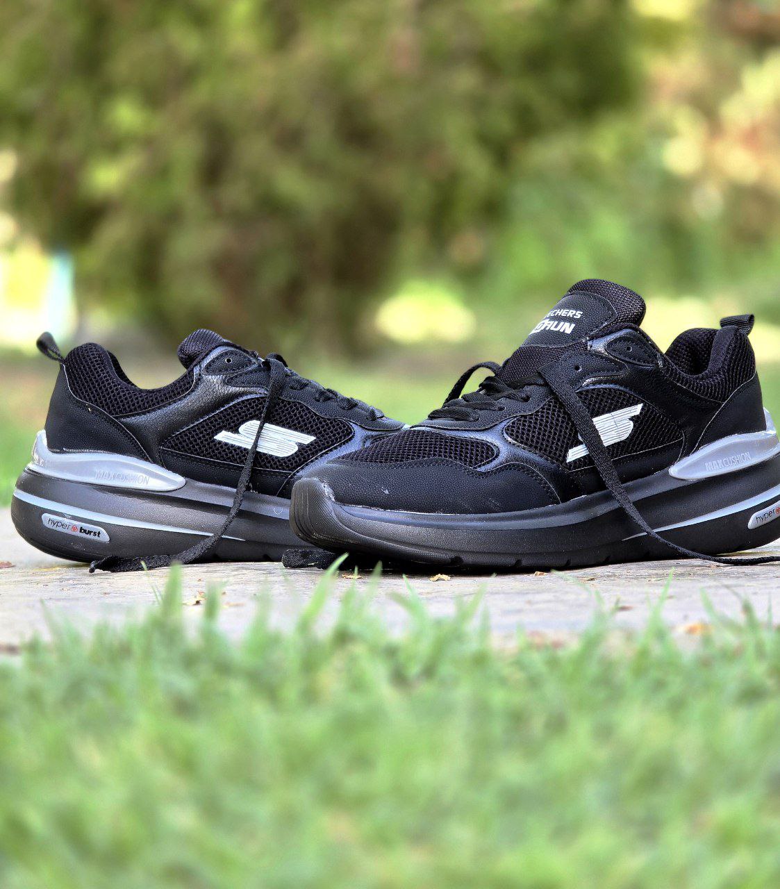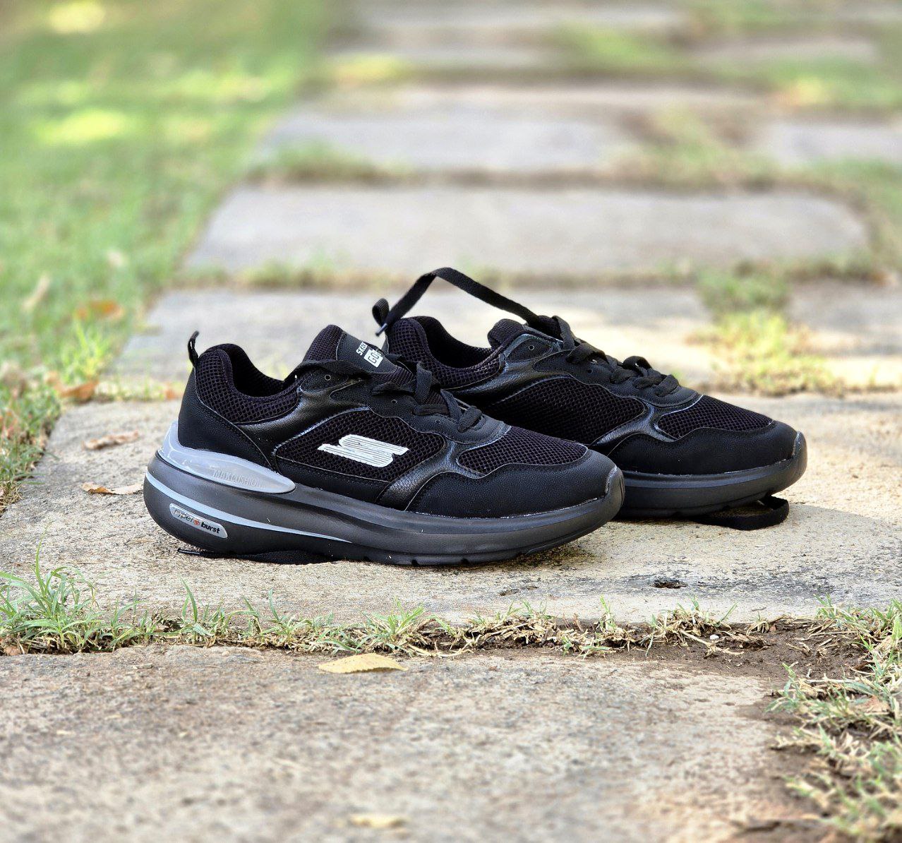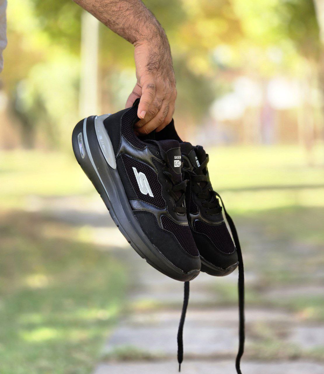 خرید اینترنتی کفش کتونی اسپرت مردانه پسرانه بزرگپا مدل اسکیچرز محکم و بادوام رنگ مشکی تمام سبک اصفهان
